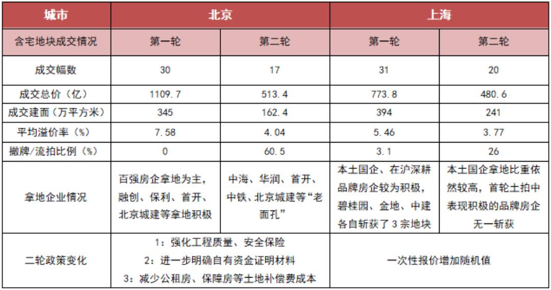 北京有26宗地延期至第三次集中土拍,上海则终止出让了7宗宅地。从成交情况来看,两城热度均有明显下降,上海尤为典型,首轮土拍中上海有六成(18宗)地块进入一次性报价,本次土拍中仅有两成(6宗)进入一次性报价。北京表现较上海稍好,共有4宗地块触及最高限价,海淀区2宗地块进入竞方案阶段。