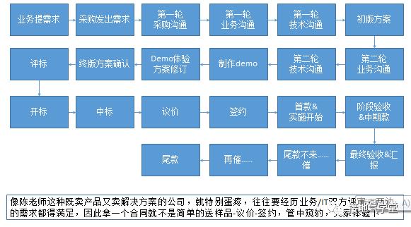 前边举的买牛奶,已经是最简单的形式了。如果是陈老师所处的软件开发服务行业,来感受下,这漫长的的从签约到交付过程(如下图)。
