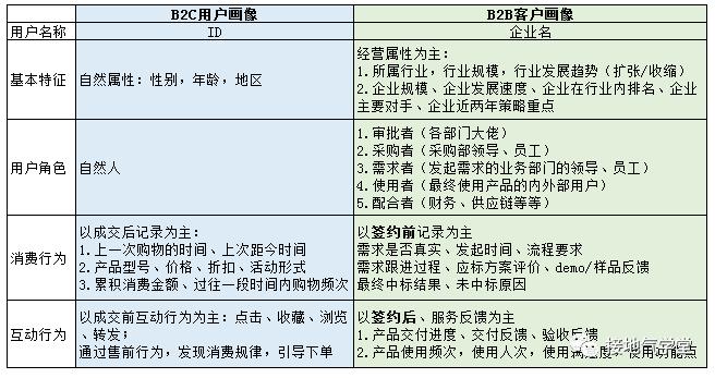 直接上图,B2B的客户画像,更多从客户企业实力、需求规模、流程长度、谈判对象这些角度进行。和B2C不同的是,B2B的客户画像采集难度更低,往往这些企业相关的信息都可以通过客户拜访、企业年报、行业报道、相关企业介绍等渠道获得。