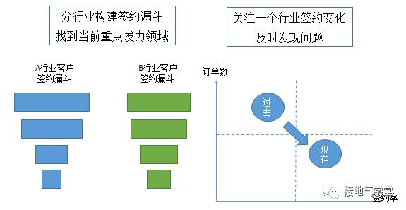 针对众多线索,则要分门别类,看不同地区、行业、企业、线索来源的签约率&签约金额,从而针对性制定计划,看我们要打哪些地区,哪些特殊企业类型,从一个行业签约情况变化中发现问题(如下图)。