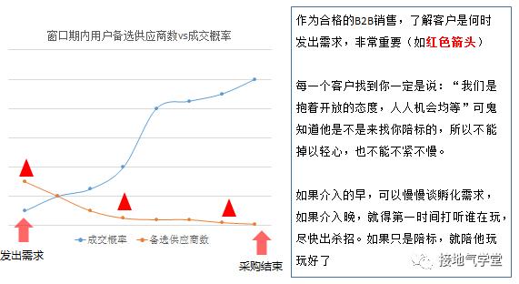 需要注意的是,B2B采购需求一但发出,就进入倒计时阶段。客户不会无限期做甄选,需求发出越久,客户见识的供应商越多,成交几率越高,筛选的也越具体。因此收到销售线索后,判断该线索所处时间段,第一时间跟进,是非常重要的。