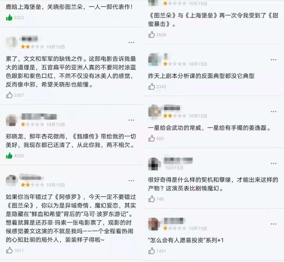 截至目前,《图兰朵》上映8天,豆瓣上的评分已从3.7降到3.5,打分的一万多人里,有53.1%的观众给出了一星。热评里大家对《图兰朵》的吐槽甚至比电影本身更有意思。