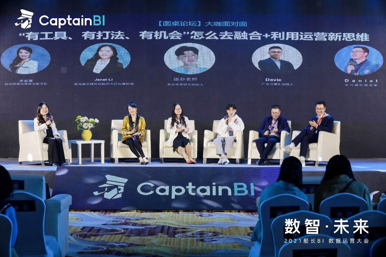 在大会最后的圆桌论坛上,杭州跨境电商协会秘书长李星慧、亚马逊全球开店杭州大区拓展经理Janet Li、米谷学堂联合创始人米谷、长尾云创联合创始人吴春华、广东百聚汇创始人Davie、亚马逊大卖Daniel 、船长BI市场总监原原,就“有工具、有打法、有机会”怎么去融合+利用运营新思维展开探讨。