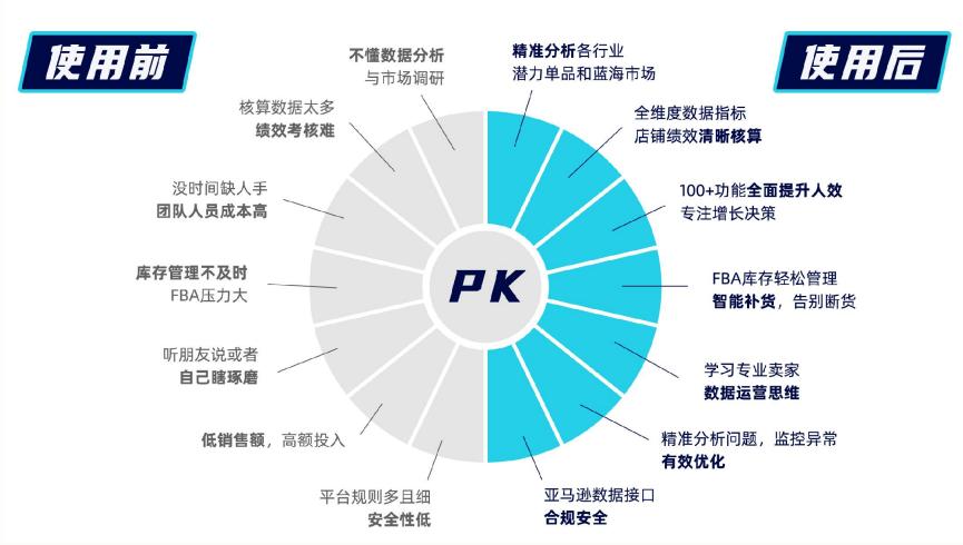 与此同时,跨境电商行业瞬息万变,卖家需要不断提升运营效率,降低运营风险,改善运营方式。当前,亚马逊卖家面临的推广痛点如潜在的各种风险(封店/下架/跟卖/断货)、片面的数据分析(店铺/商品报表繁琐;数据分析有限)、粗放的运营管理(经验单一、运营人才稀缺)、庞大的客户群体以致难以精细化管理、强大的竞争对手等,亚马逊卖家进行数据分析和全流程精细化管理尤为重要。