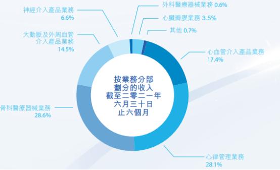 自去年上半年开始,骨科医疗器械业务的营收占比就已经达到28.2%,与心血管接入产品业务的营收几乎并驾齐驱。今年上半年,骨科医疗器械业务营收占比为28.6%,超越心血管接入产品业务,成为微创第一营收来源。