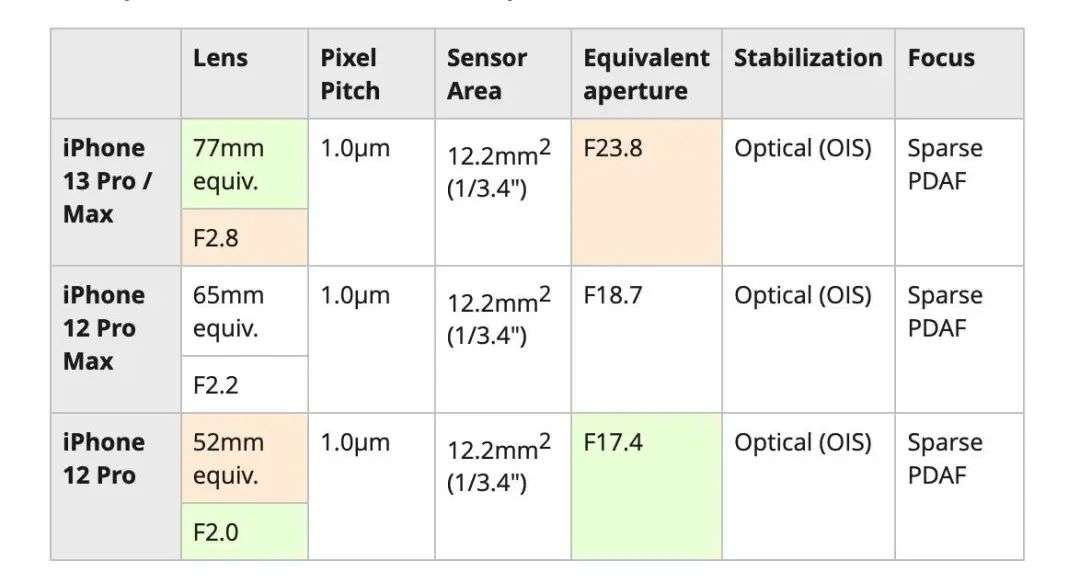 iPhone 13 Pro Max、iPhone 12 Pro Max、iPhone 12 Pro 三者长焦摄像头对比(包括等效焦距与光圈). 图片来自:dpreview