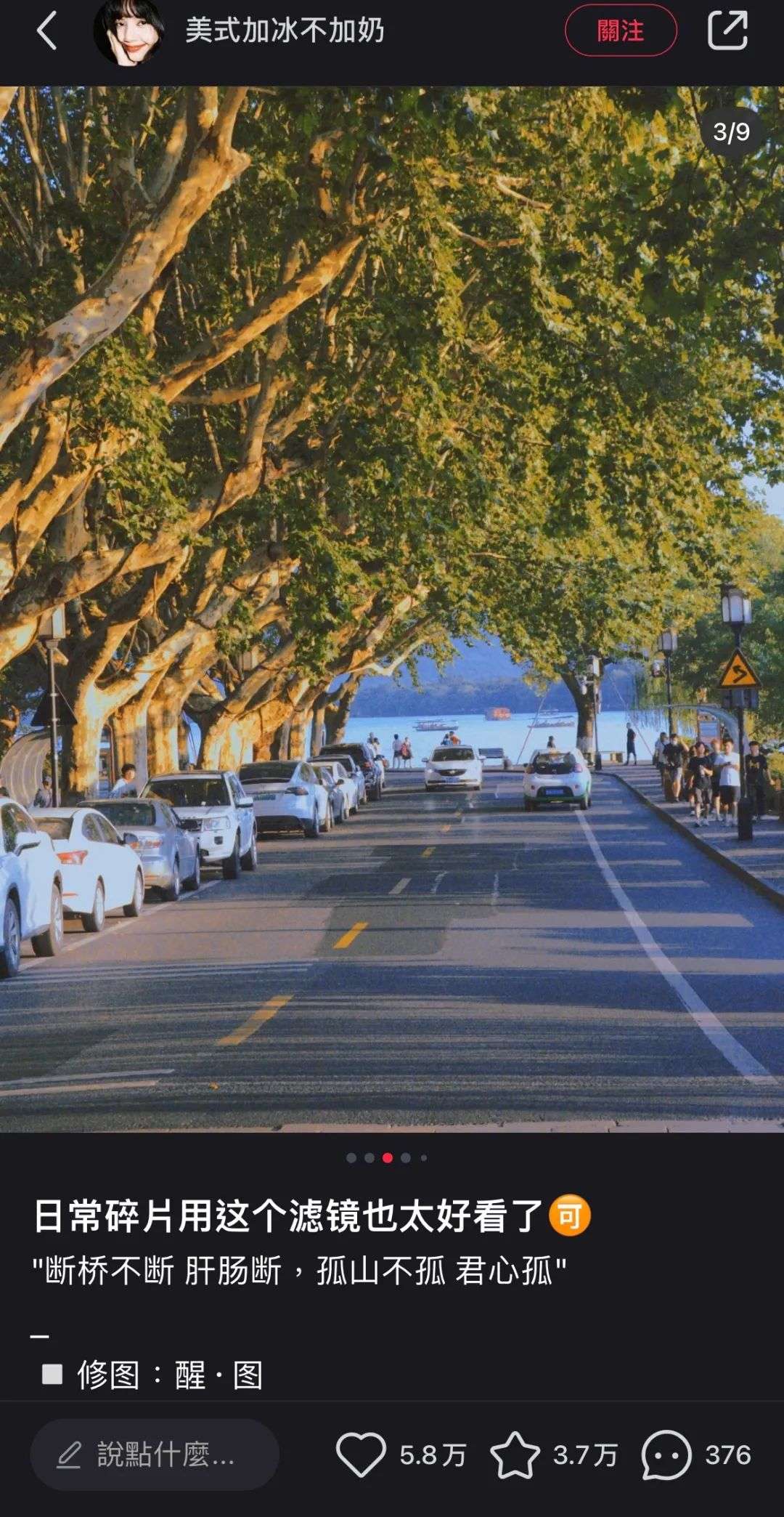 西湖,长椅、一半黄一半绿的梧桐……虽然博主没有说这是什么季节的杭州,但光从颜色来看,就难免想象到初秋午后,给人一种闲适的感觉。