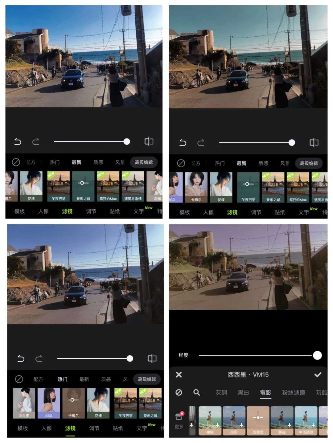 (4个滤镜分别是爱乐之城、午夜巴黎、卡梅尔和西西里)