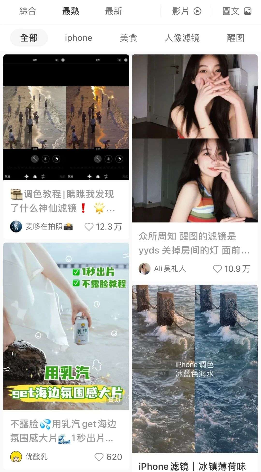 我们搜索“滤镜”并按热度降序排列之后,发现排名靠前的滤镜教学笔记中,虽然每一幅样张上面都只有好看的风景或脸蛋,但又好像都写着“王家卫”或者“是枝裕和”。