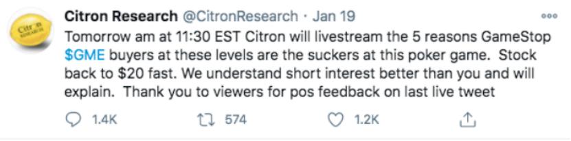 1月22日,华尔街知名空头机构香橼发推称,“我有5种法子证明,GME只值20美元”。这条傲慢的推特像一条导火索,迅速引燃了散户心中积压已久的怨气。