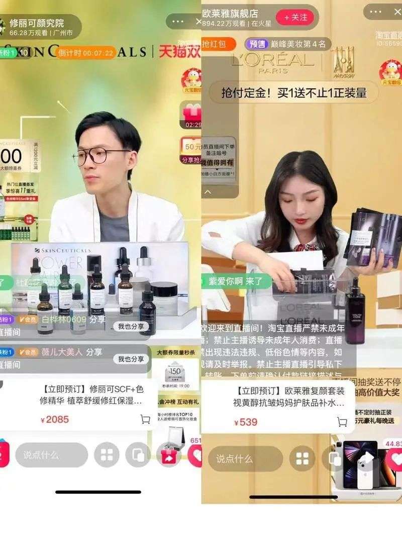 一位身着白大褂的护肤专家,一边讲解不同颜色精华中的护肤成分,一边强调直播间的红包和抽奖活动。部分“懂行”的修丽可老用户计算发现,直播间链接的价格优惠力度,竟然和薇娅、李佳琦直播间相同甚至更大。