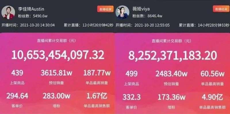 在预售日的直播中,李佳琦直播间累计交易额高达106亿元。薇娅直播间累计交易额达82.52亿元。