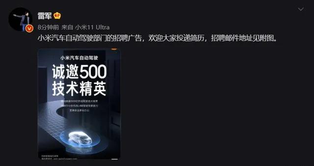 在人员招聘方面,小米官网有关汽车行业相关岗位的招聘就包括了超声波雷达算法、激光点云算法、定位、毫米波算法、高性能计算/深度学习模型优化等多个自动驾驶工程师岗位。7月28日,雷军还亲自在微博发布了小米汽车自动驾驶部门的招聘广告。