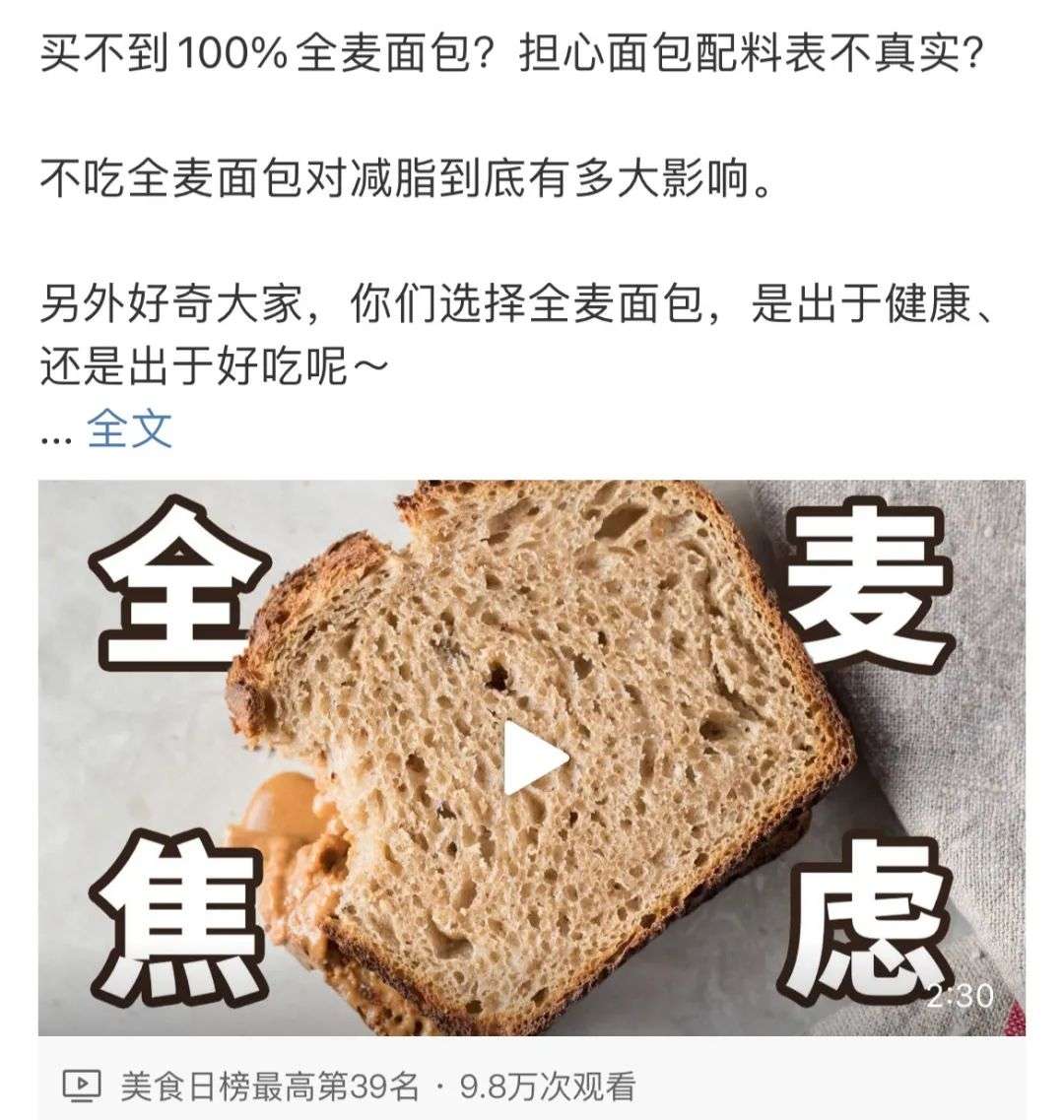 人们对于而不熟悉的领域总是有所顾虑,而全麦面包作为一个近年来新兴起的品类,仍需要更持续的消费者教育。目前已经有一些科普号和博主对对全麦面包进行了测评,帮助消费者们了解为消费者解答一些对于热量、配料、营养成分方面的疑惑。