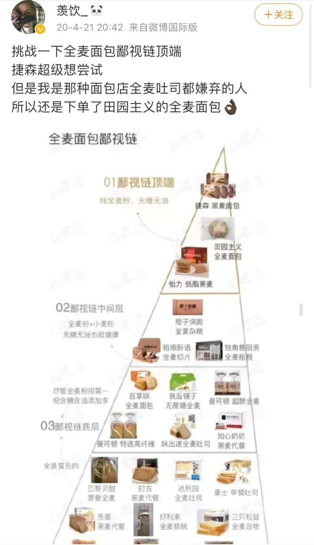 热心的网友们为全麦面包做好了鄙视链,也反向推动着全麦面包品类的创新突破。随着消费者对全麦面包所含成分和营养的深入关注,全麦面包在口感、制作工艺、营养成分和行业标准等方面都急需升级。