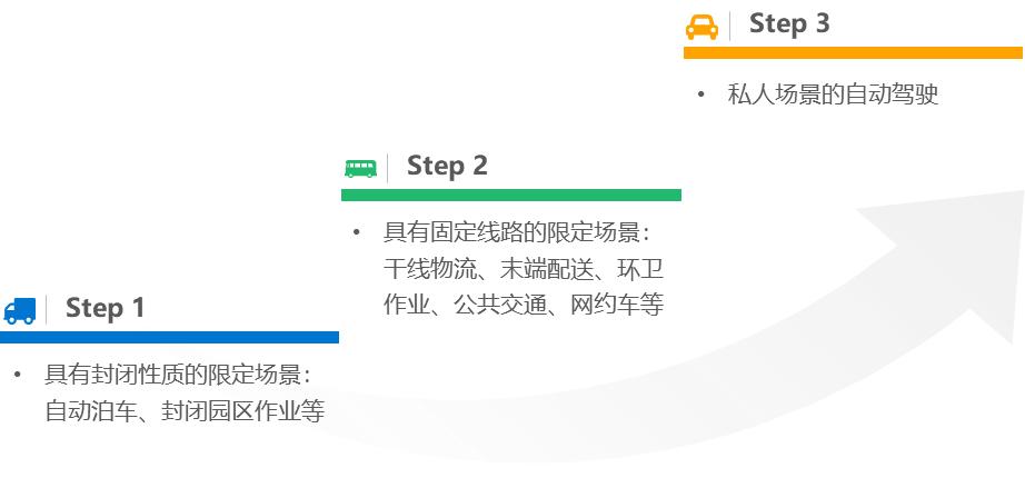 受技术应用难度和法律法规限制影响,自动驾驶的商业化应用通常遵循先封闭后开放、先载货后载人的原则,在不同场景内逐步落地展开。首先,在自动泊车、封闭园区等具有封闭性质的限定场景内率先应用;其次是干线物流、末端配送、固定线路的环卫领域、公交地铁通勤、网约车等;最后才是私人场景的自动驾驶。