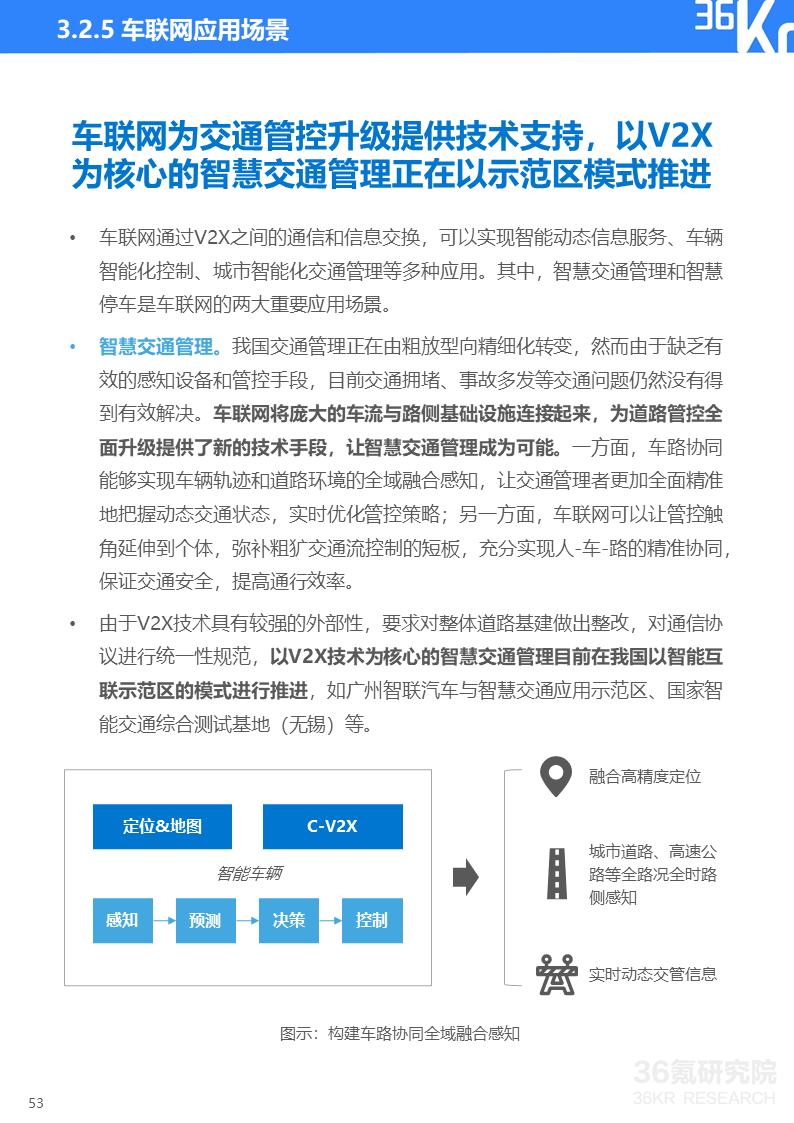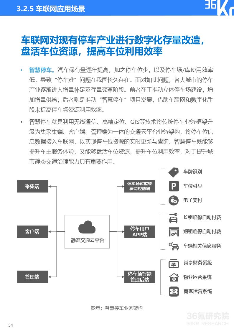 车联网为交通管控升级提供技术支持,以V2X为核心的智慧交通管理正在以示范区模式推进。另外,车联网亦可对现有停车产业进行数字化存量改造,盘活车位资源,提高车位利用效率。