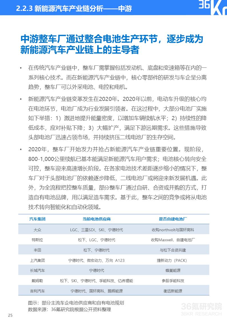 2020年,整车厂开始发力,抢占新能源汽车产业链重要位置。部分整车厂通过自研、合资或并购的方式,打造自有电池品牌,用以满足造车需求。基于此,整车之间的竞争或将从电池技术转向智能化和自动化领域。随着对关键零部件和核心技术掌控力的加强,整车厂逐渐成为产业链主导者。