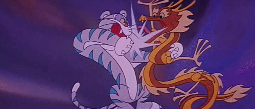 会喷火的猛虎和喷水的巨龙扭打在一起,蛋生和狐妖也为了抢夺天书在悬崖峭壁上跳跃穿梭。