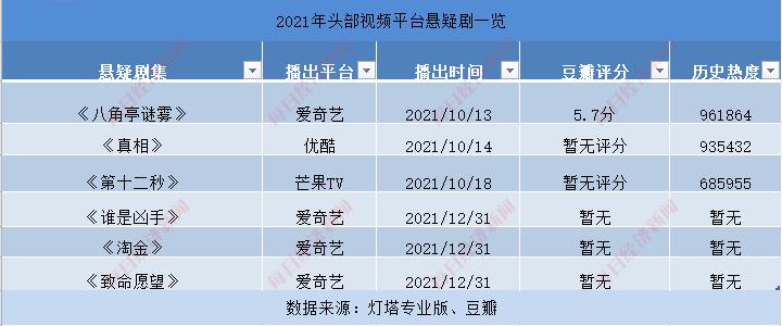 在已经播出的3部悬疑剧集中,优酷的《真相》和爱奇艺的《八角亭谜雾》在热度不相上下,历史最高热度均超90万;在口碑上,目前《真相》《第十二秒》暂无评分,尚未能看出观众对这两部剧集的评价。