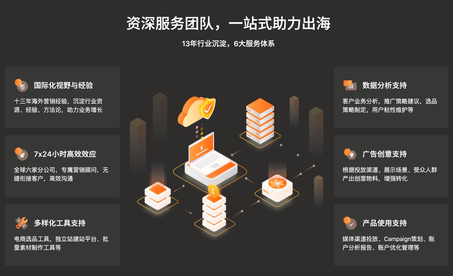 升级后的出海营销服务在以上基础上,全新推出以下6大服务体系,在帮助用户获取全球的流量资源同时,也帮助解决广告主在出海之路上的所有痛点。