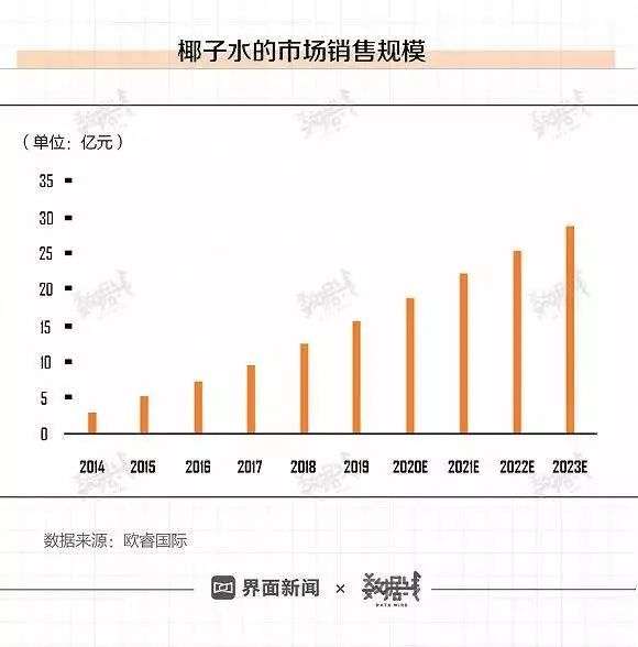 在美国等市场,椰子水更受消费者欢迎。Euromonitor 统计数据显示,2020 年,全球的椰子水市场规模约 20 亿美元,其中美国市场规模约为 6.58 亿美元。这一品类未来 5 年仍然以较快的速度增长,至 2023 年可达 28.7 亿元。