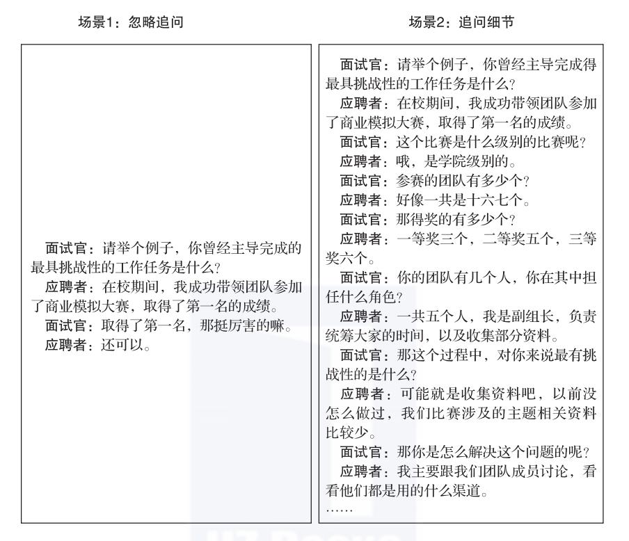 然而,通过场景2中的层层追问,面试官了解到,比赛的等级并不高,得奖也并不是特别难,而且应聘者在实际任务中只是统筹时间和收集资料,收集资料的途径也不是自己思考独立解决的,根本无法有力地证明其具有较强的领导力和卓越的交付力。