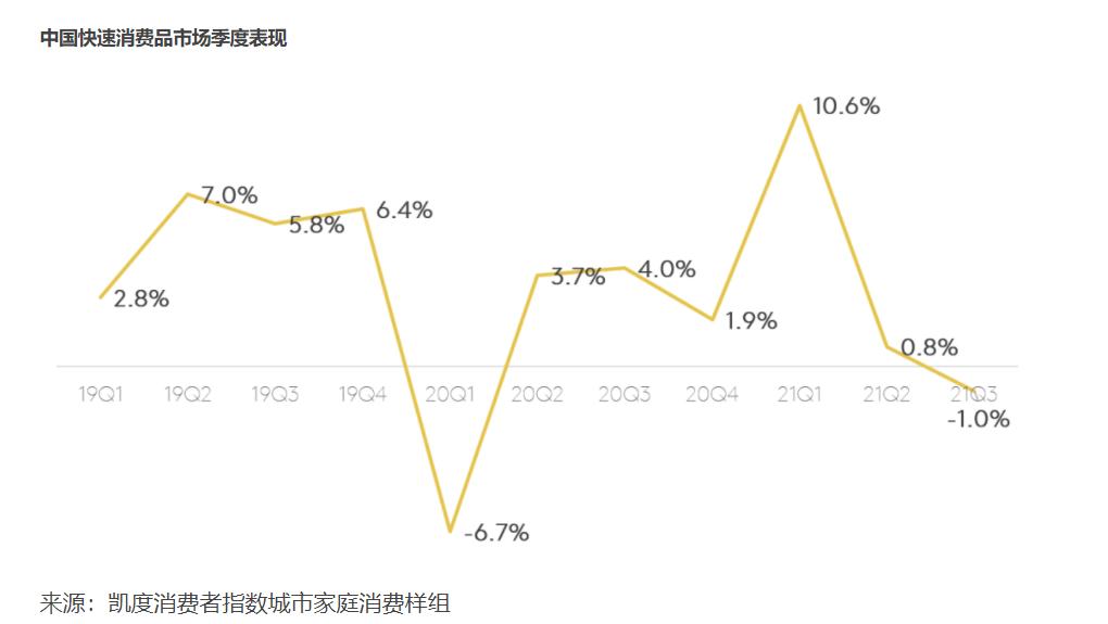 据凯度消费者指数的最新报告显示,今年前9个月,中国快速消费品 (FMCG) 销售额与去年同期相比增长3.6%,其中2021年第三季度下跌1%,增长点主要来自新式茶饮的助攻(同比增长10%以上),而现代渠道(大卖场、超市和便利店)同比下降了2.9%。
