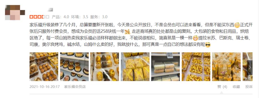 家乐福表示,目前会员店和普通大卖场的重叠度不超过1%,但毕竟优质供应商有限,不同品牌会员店之间不免存在商品重合的问题。有用户评论道,“走进商场真的处处都是山姆复刻,不能说很相似,简直就是一模一样。”