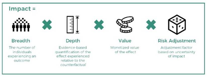 TPG旗下上善睿思基金(The Rise Fund)就主动出击,与国际审计机构合作,以审计的思路搭建了一套项目筛选模型。TPG还独创以数据为基础的影响力货币乘数IMM,将影响力变成可以被衡量的指标,并研究出影响力定义公式:I=ntva,I 表示总影响力,n表示受影响的单位数,v表示影响力的货币化价值,a是基于t和v的不确定性的调整因子。