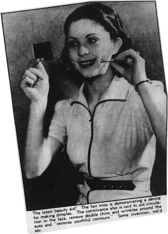 1936年,纽约女发明家伊莎贝拉(Isabella Gilbert)推出了一款网红美容仪——Dimple Maker,翻译过来就是酒窝制造机。它本质上就是个形似耳麦的铁架子,不过罩住的不是耳朵,而是卡在了脸颊上。