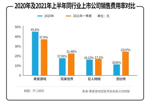 在2021年一季度,青瓷游戏销售费用率为37.9%,依然高于完美世界21.48%、巨人网络17.1%、吉比特23.07%。