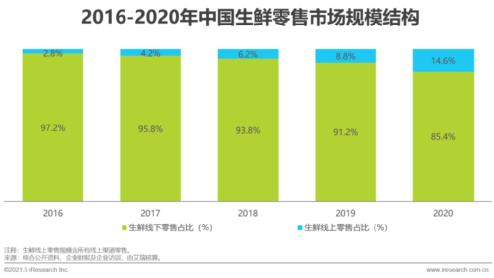 原本超过10%的生鲜线上零售占比,在2020年突飞猛进到14.5%。