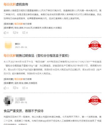 每日优鲜的投诉中主要为虚假宣传、菜品质量以及服务态度等方面。