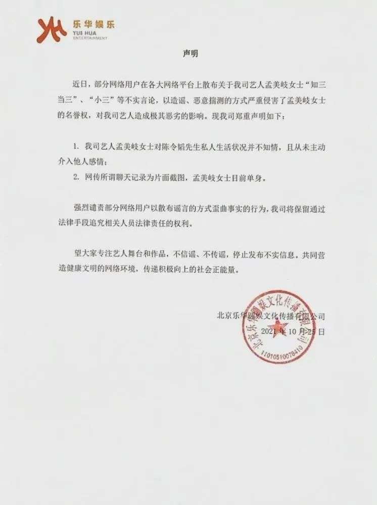 当日中午,孟美岐所属娱乐公司乐华娱乐发布严正声明,表示孟美岐对陈令韬私人生活状况并不知情,且从未主动介入他人感情,目前仍处于单身,该条微博三小时后评论数破5万。随后孟美岐接受新浪娱乐采访,称是“在认为男方单身的前提下才和他交往”,现已分手,并在个人微博中表示“从未想过介入他人感情”。