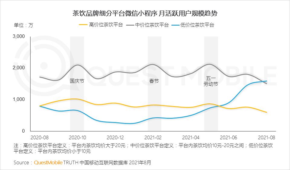 1.2 茶饮品牌微信小程序稳步发展,节假日需求激增;数量较多、更多选择性的中价位茶饮为主流平台,以蜜雪冰城为代表的低价茶饮平台在2021年系列热点营销中脱颖而出,小程序流量持续提升
