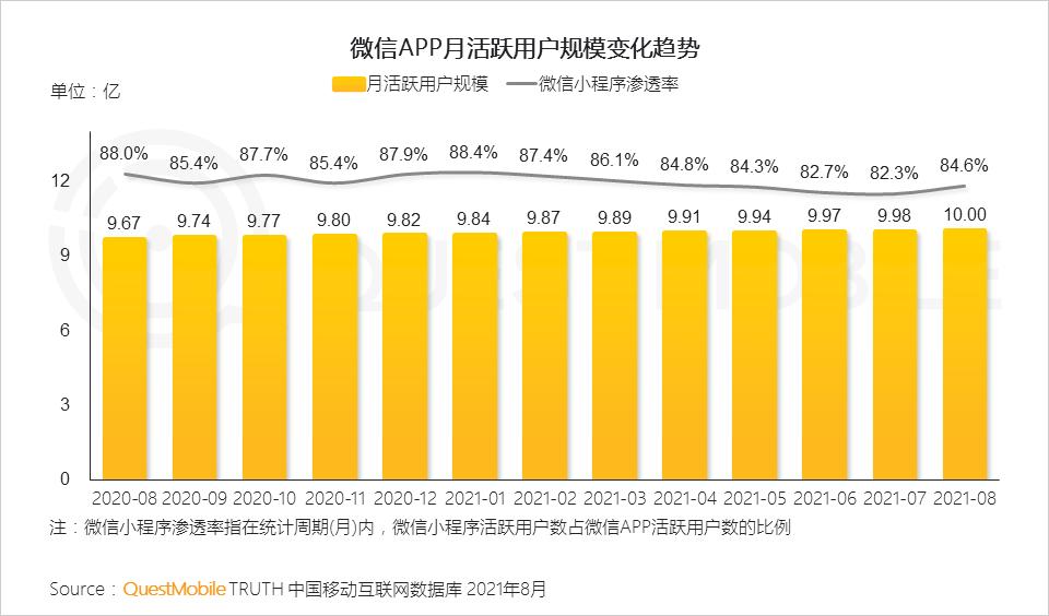 1、随着微信生态日益完善,月活跃用户规模已达10亿量级,承接服务功能的微信小程序与生态连接加深,渗透率稳步在八成以上