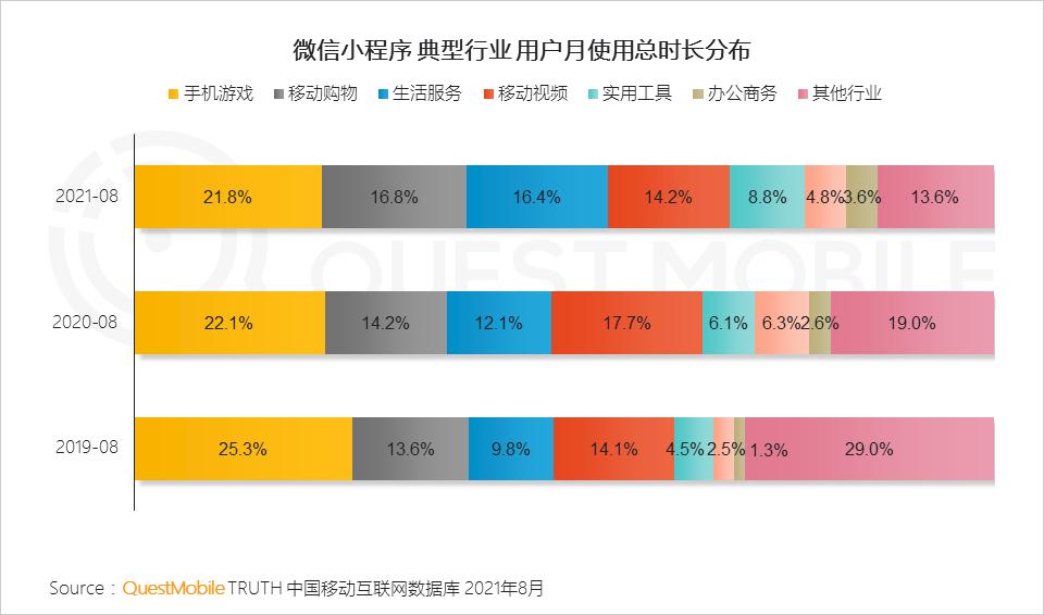 QuestMobile数据显示,截止到2021年8月,微信小程序在微信月活用户中的渗透比例已经达到84.6%,月活用户规模超过千万的小程序数量已经达到115个,其中,行业时长集中度也显著上升,手机游戏、移动购物、生活服务、移动视频分别占据21.8%、16.8%、16.4%、14.2%。