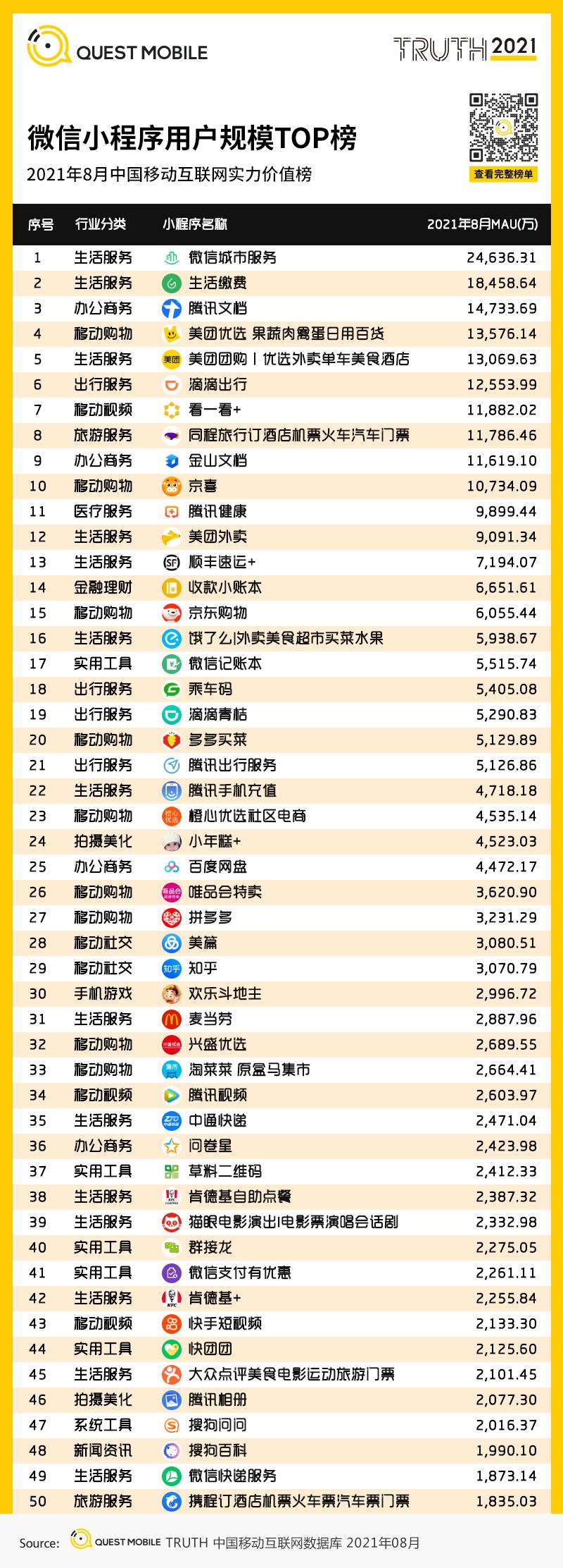1、微信小程序用户规模TOP榜