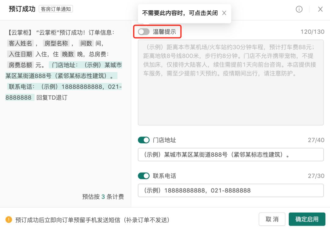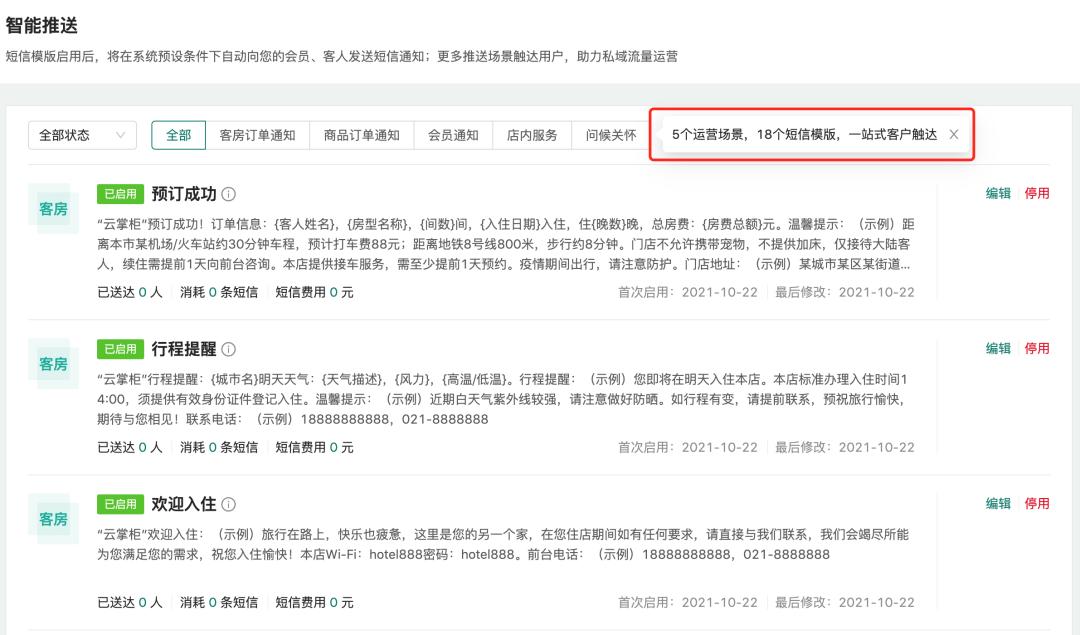 此次更新后,智能短信模板的数量大大增加,根据客人预定流程,预设18个发送场景,涵盖订单状态、民宿信息、客房设施、天气交通等。