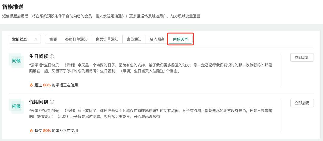 新版「智能短信」功能新增【问候关怀】板块,包含生日问候、假期问候等。虽说现在是一个信息大爆炸的时代,但其实大多数人都是孤独症患者,如果能在生日当天,收到一份远方的生日祝福,一定会对这家民宿好感度大大提升。