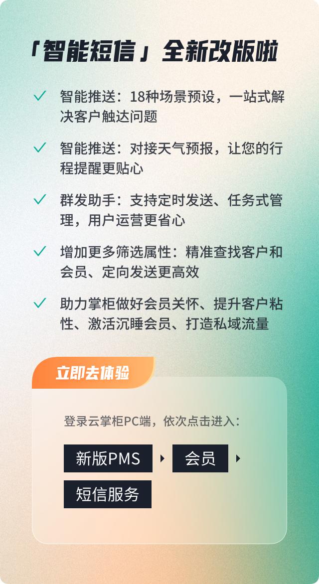 掌柜们,周五好!本周云掌柜「智能短信」全新改版!这都是产研同学一根根头发换来的新功能呀,一起来看看有哪些新玩法吧~