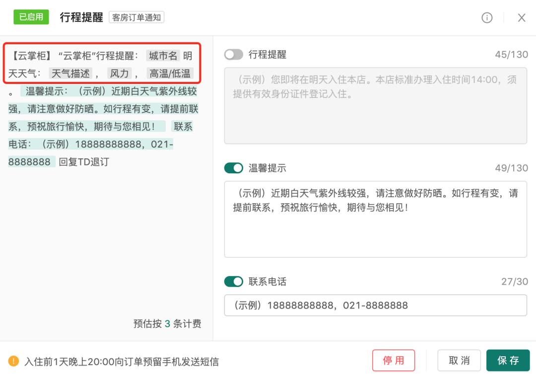 此次我们在“行程提醒”模板中,新增了自动抓取民宿当地天气信息的功能,在短信模板中自动生成智能天气预报。