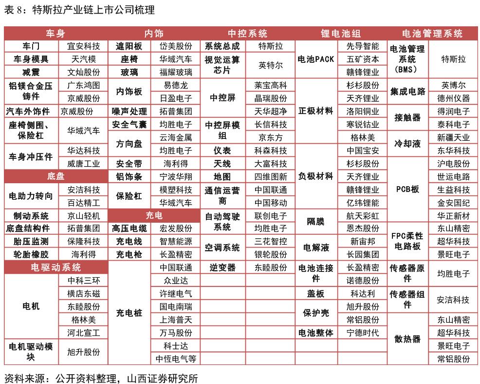 由于汽车产业链多数零部件运输成本较高,国内采购更有优势,因此国内多家企业已进入特斯拉供应链,零部件已涵盖动力电池、车身、底盘、内饰、充电、电驱、中控及热管理系统。