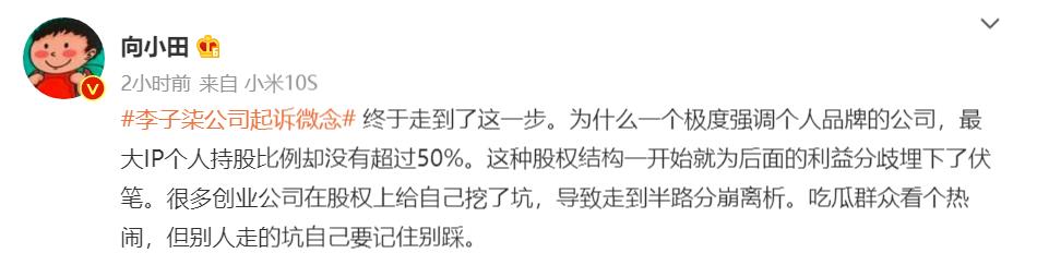 新浪财经专栏作家向小田分析表示,一个极度强调个人品牌的公司,最大IP个人持股比例却没有超过50%,这种股权结构一开始就为后面的利益分歧埋下了伏笔。