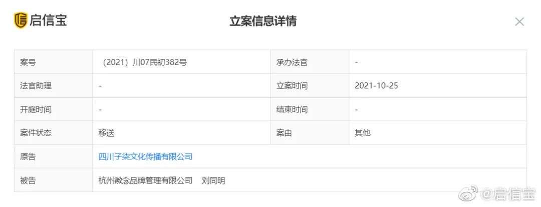 启信宝显示,10月25日,四川子柒文化传播有限公司与杭州微念品牌管理有限公司新增立案信息,一审原告为四川子柒文化传播有限公司,被告为微念公司及刘同明。经办法院为四川省绵阳市中级人民法院。