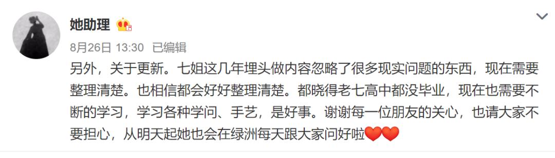 而在8月26日,李子柒的助理就发布微博否认,“关于更新。七姐这几年埋头做内容忽略了很多现实问题的东西,现在需要整理清楚。也相信都会好好整理清楚。都晓得老七高中都没毕业,现在也需要不断的学习,学习各种学问、手艺,是好事。”