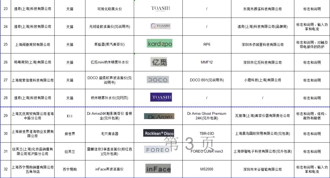 根据上海市市场监督管理局公布的抽检结果显示,此次抽检产品中存在标志和说明不合格的最多,有31批次,包括Refa双球滚轮点部美容仪(型号:RF-SC1855B)、露娜迷你3净透洁面仪(粉红色)(型号:FOREO LUNA mini3)、Dr.Arrivo24K魅影美容仪(香槟金)(型号:Dr.Arrivo Ghost Premium 24K)等。公告指出,标志和说明不合格,容易误导消费者使用,造成不必要的损失。