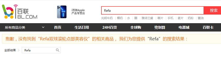 10月26日,青眼就关注度较高的数个产品在上述平台进行搜索发现,i百联已无“Refa双球滚轮点部美容仪”相关商品,Kardizpo康浦旗舰店也已没有蒸脸器相关商品,真快乐综合网购商城也已搜不到存在标志和说明问题的玛瑞莎嫩肤美眼仪相关商品。