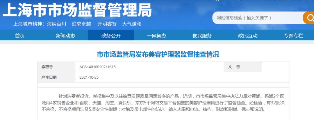 为了保证“双十一”大促中美容护理器具相关产品质量的安全性,10月25日,上海市市场监督管理局针对消费者投诉、举报集中及以往抽查发现质量问题较多的产品,加大执法力度,对黄浦、杨浦2个区域内4家销售企业和i百联、天猫、淘宝、真快乐、京东5个网络交易平台销售的美容护理器具进行了监督抽查并发布公告。